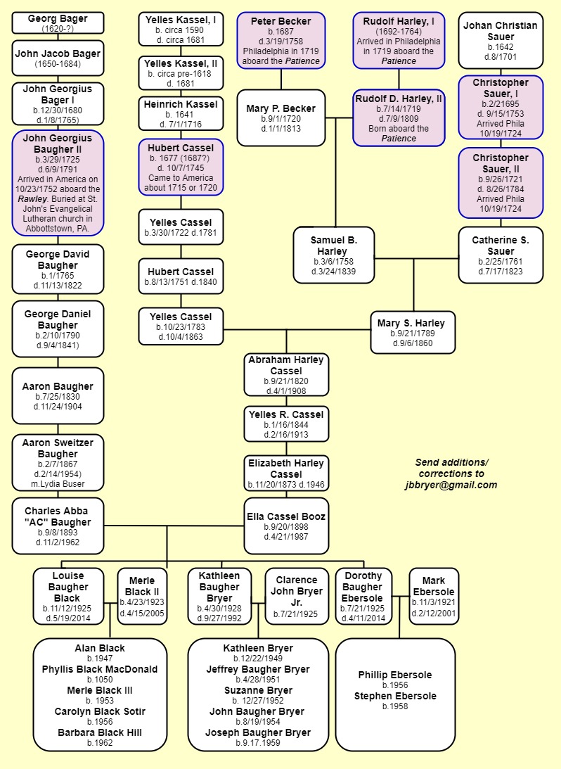 family tree: Baughers, Cassels, Harleys, Beckers, Saurs